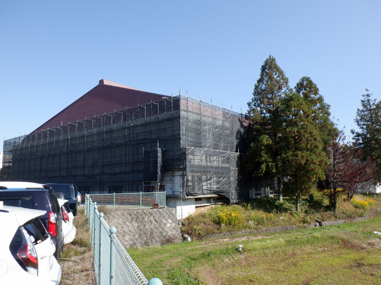 外壁構造体の損傷部補強工事・アリーナ特定天井の耐震化に絡め、外壁・屋上防水も同時にリフレッシュ致します。